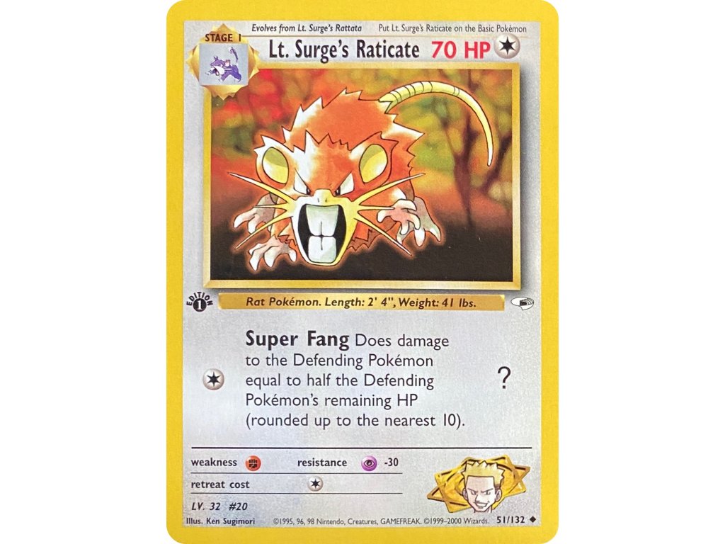 Originální Pokémon karta Lt. Surge's Raticate 51/132 z prvního vydání edice Gym Heroes.