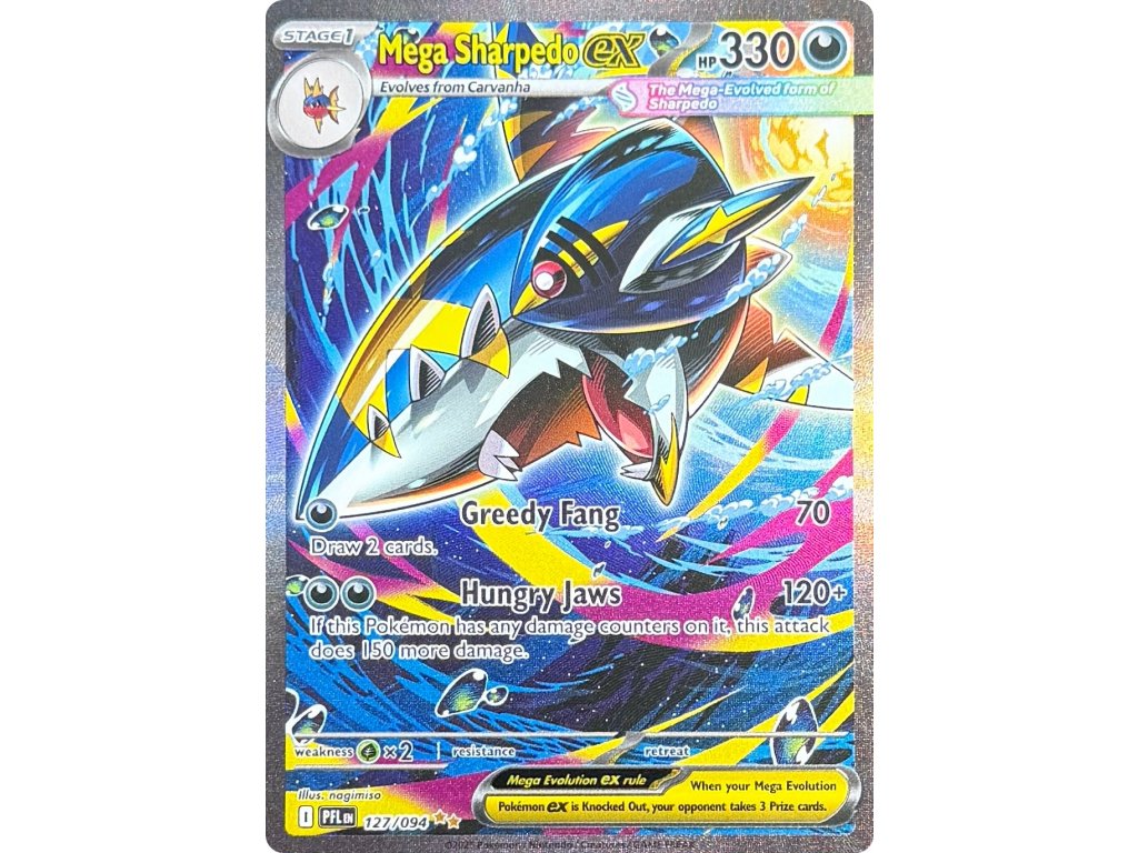 Originální Pokémon karta Mega Sharpedo EX 61/94 z edice Phantasmal Flames.