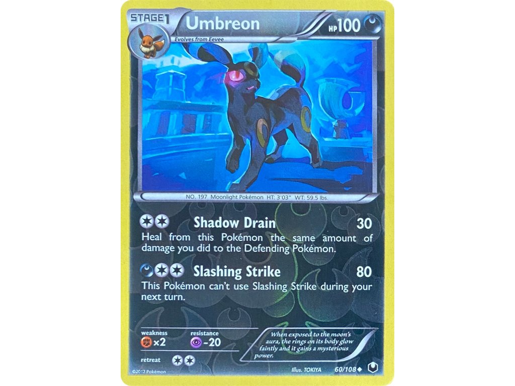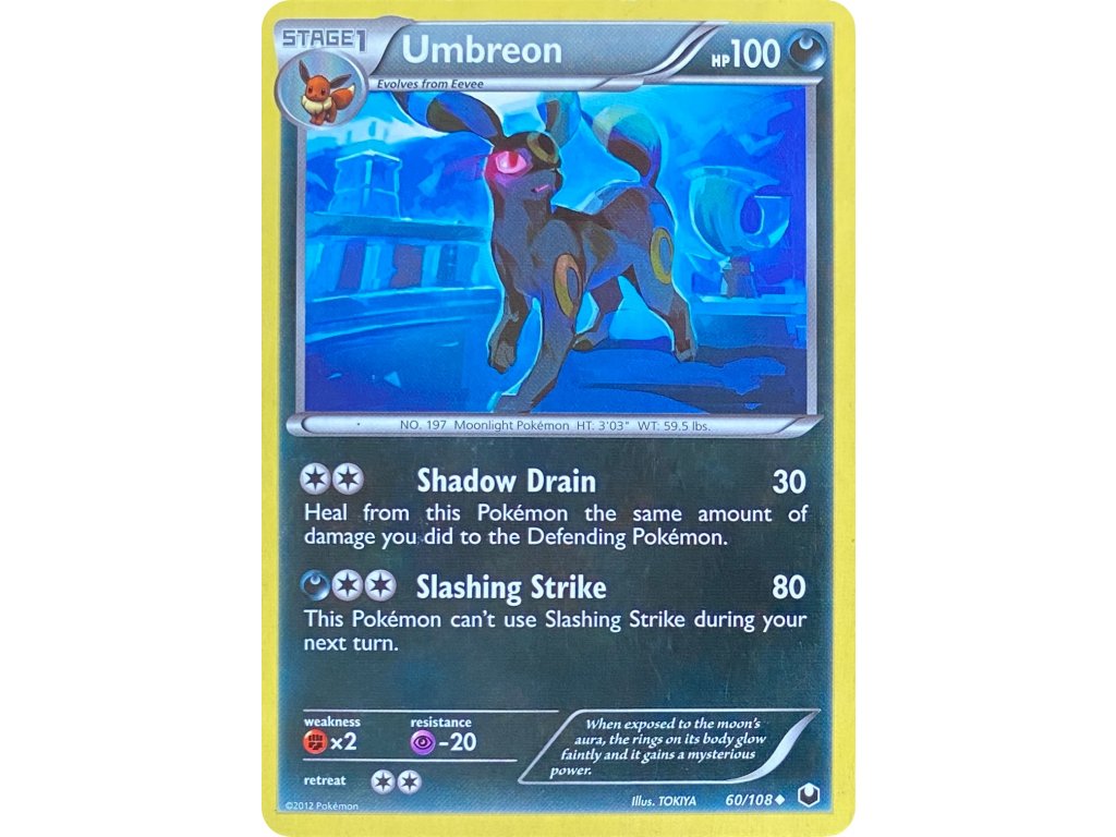 Originální Pokémon karta Umbreon 60/108 z edice Dark Explorers z roku 2012.